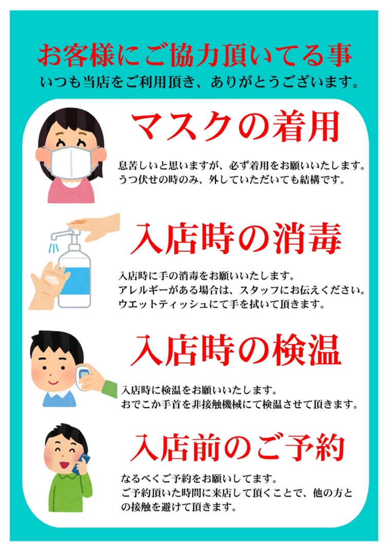 お客様に安心してご来店いただけるよう、来店の際に以下のことをご協力お願いしております。