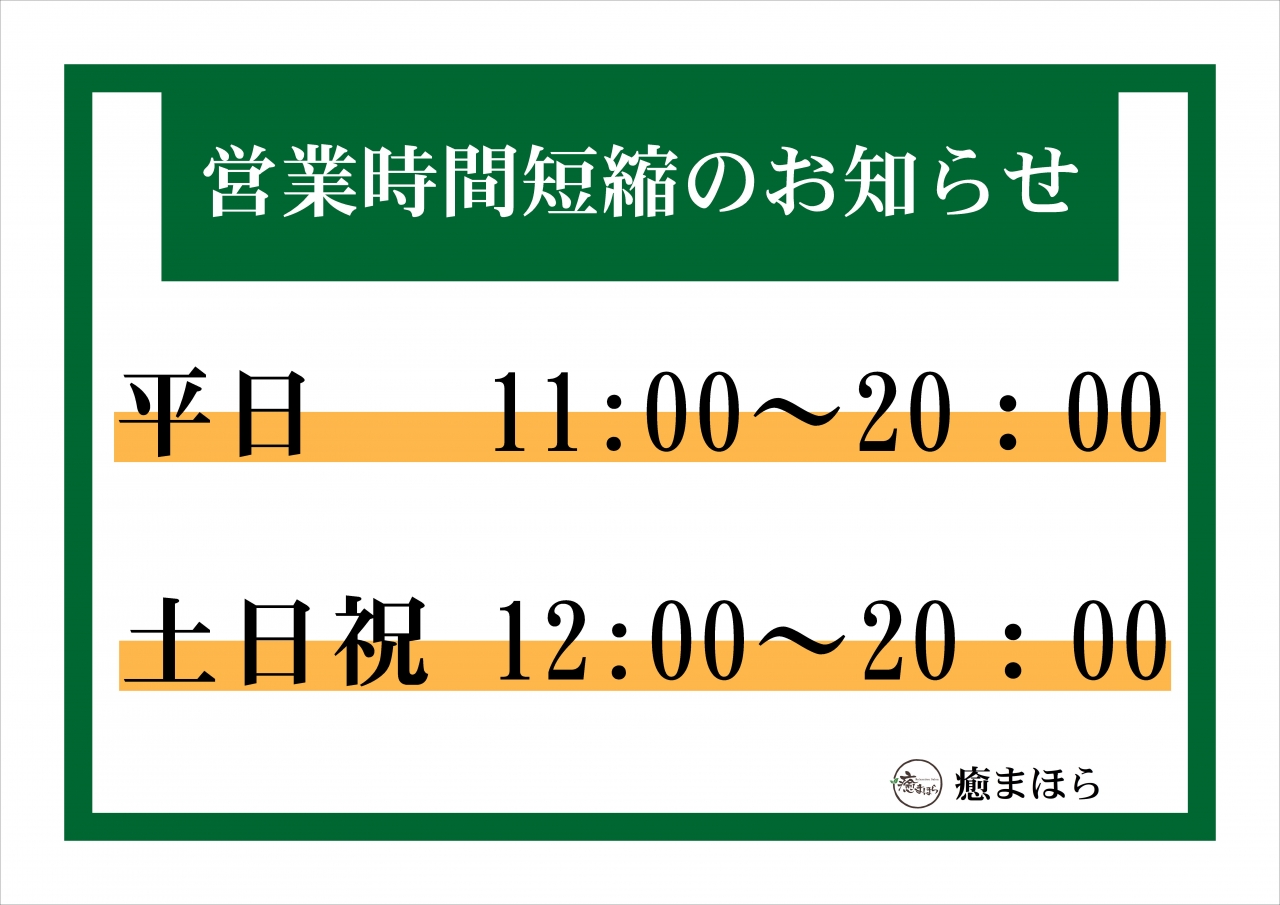 緊急事態宣言発令中の営業時間変更のおしらせ