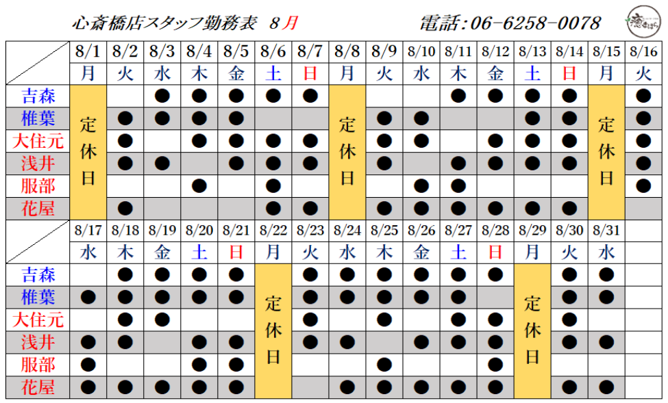 8月の出勤スタッフのお知らせです