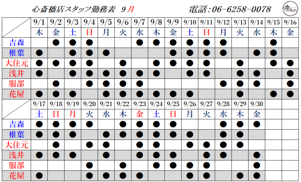 9月の出勤スタッフのお知らせです