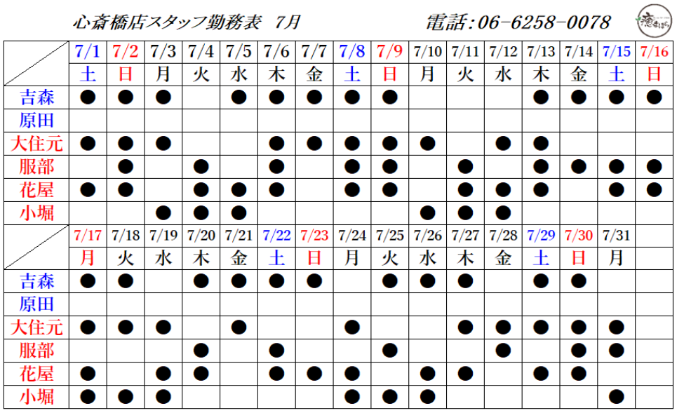 7月の出勤スタッフのお知らせです
