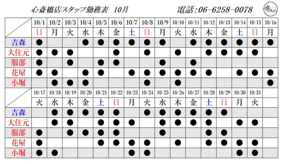 10月の出勤スタッフのお知らせです