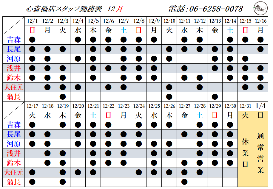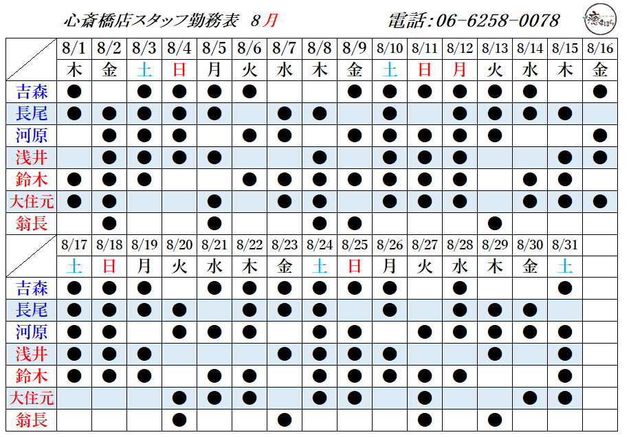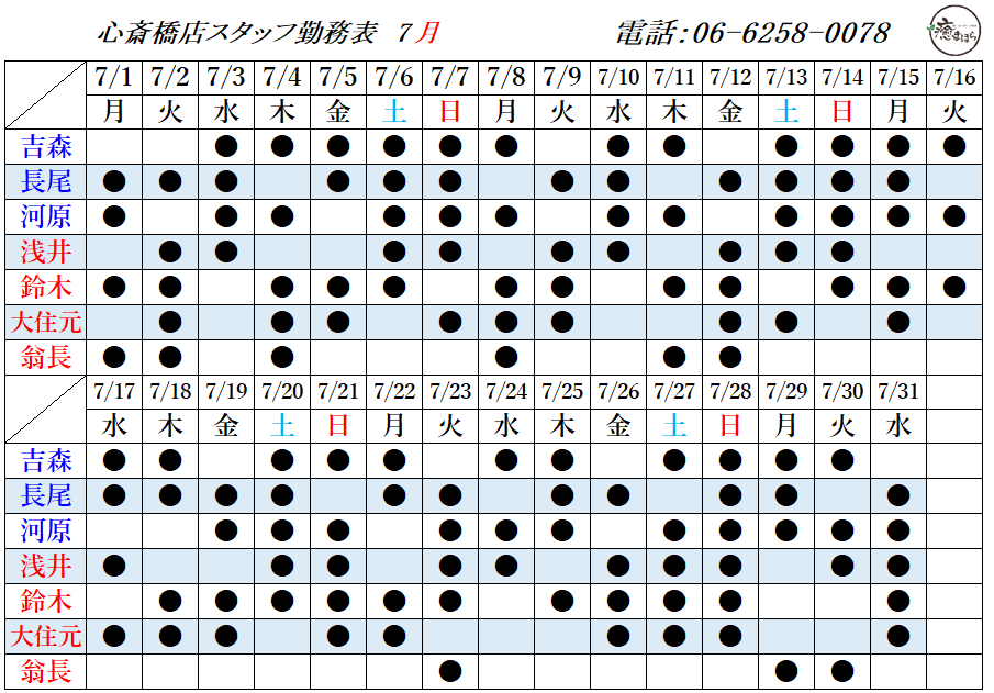 7月の出勤スタッフ表のお知らせです( *´艸`)