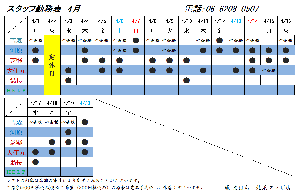 9月出勤スタッフのお知らせ★~マッサージなら心斎橋駅スグ癒まほらへ~